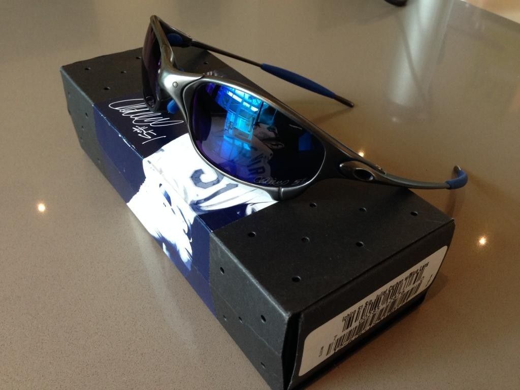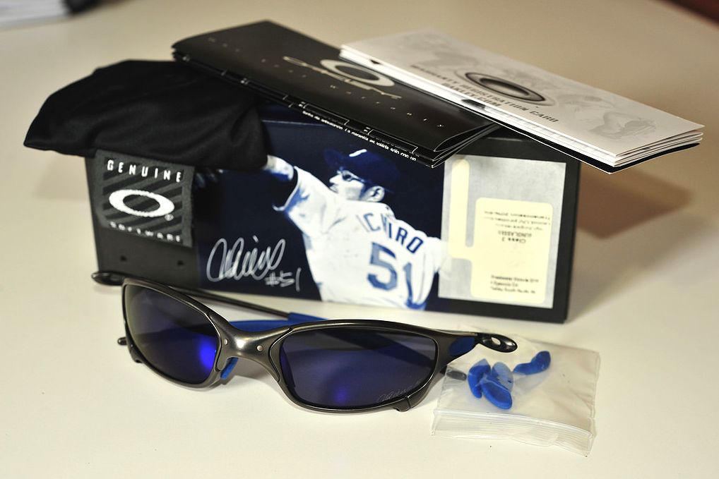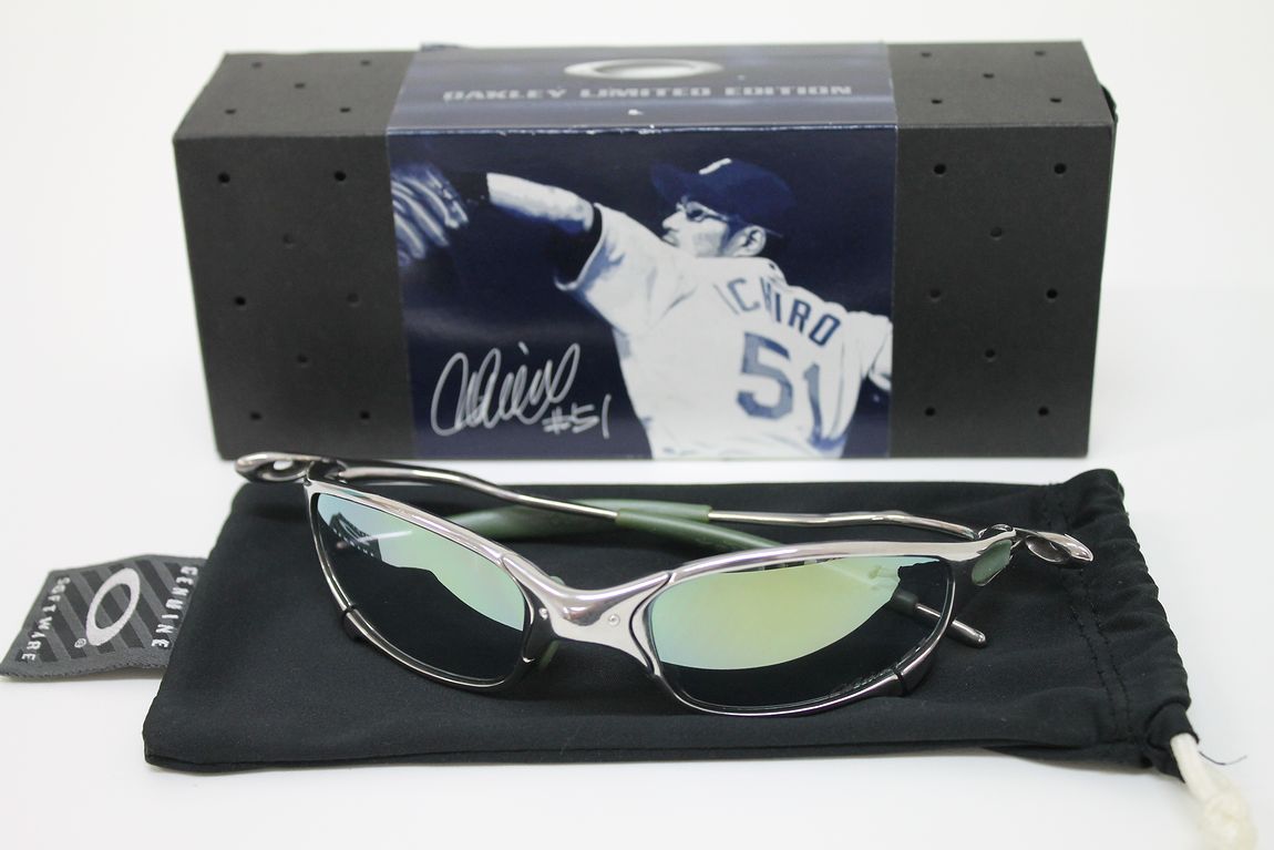 ![]() | ICHIRO JULIET Carbon / OO Blue Iridium / Blue Rubber 2004年に発売されたモデル。カーボンフレームにOOブルーイリジウム、ラバーパーツはブルー。 発売とほぼ同時に販売中止となり、ごく少数しか市場に出回らなかったとてもレアなイチローシグネチャーモデル。 OAKLEY JAPANのプレスリリースではイチローモデルにカウントされていないので、おそらく正規ルートでの国内販売は無かったものだと思われます。レンズには「Ichiro51」の刻印、シリアルナンバーもIS #####が付いている。何本が市場に出たのか、そしてなぜ販売中止になったのかは不明。 |
