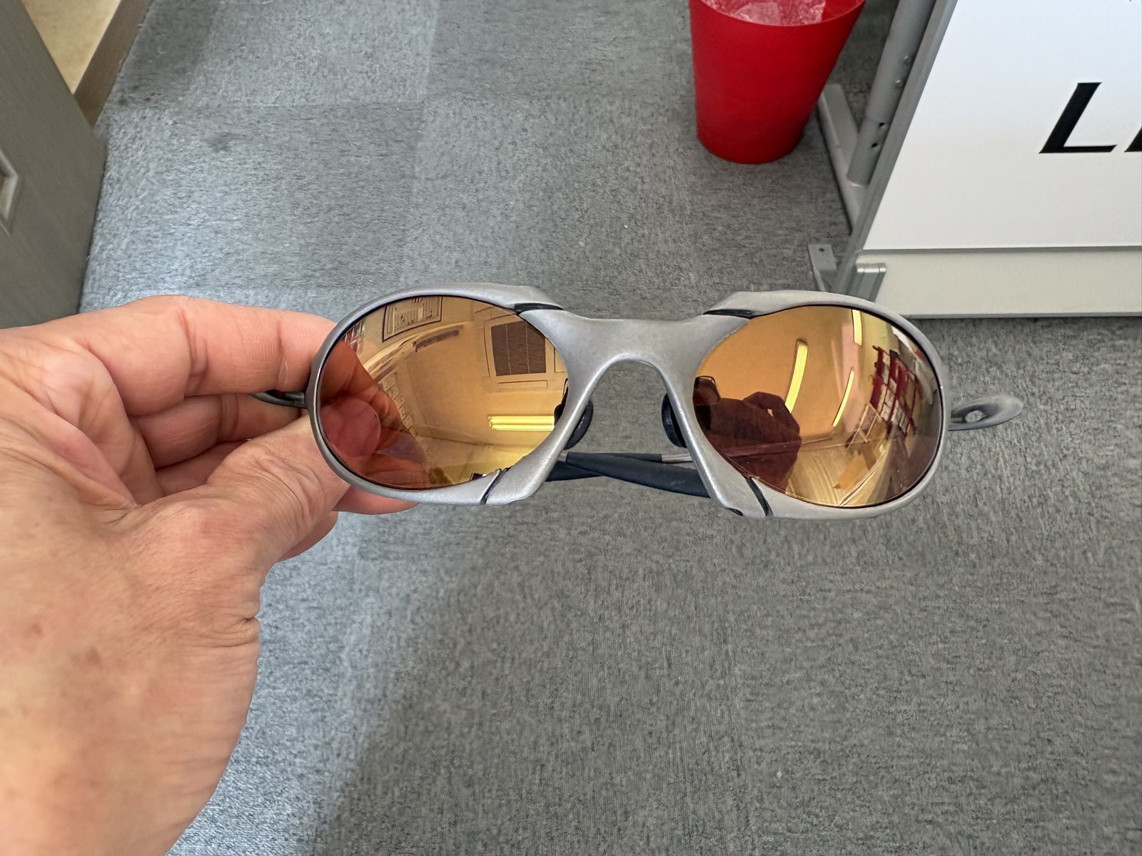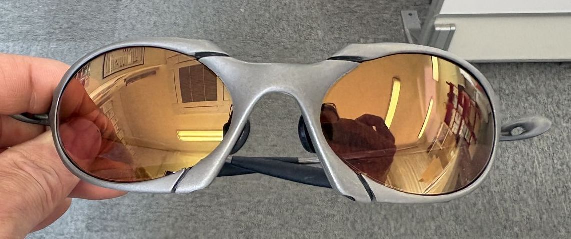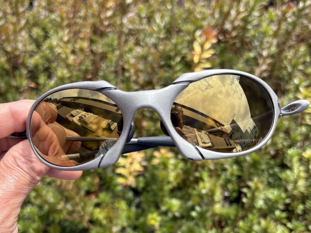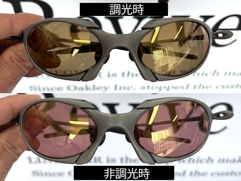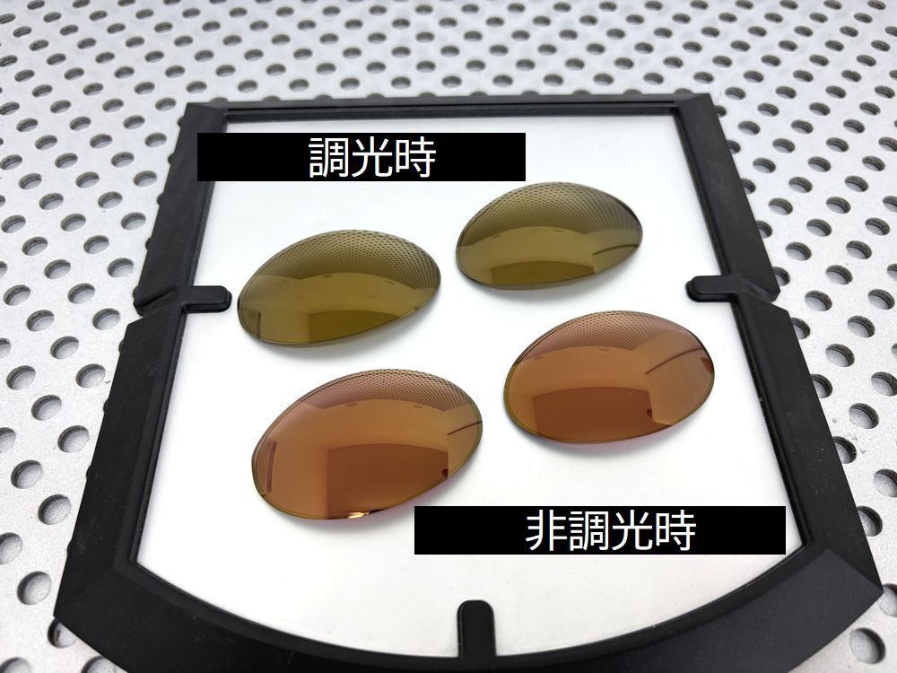 レンズカラーの印象としては、調光していないときは透明感のある、少しピンクっぽいゴールド、調光時はゴールドミラーが強調されます。ミラーがしっかりと入っているので、非調光時でもほとんど目が透けて見えることはありません。とても上品な印象のゴールドレンズになります。