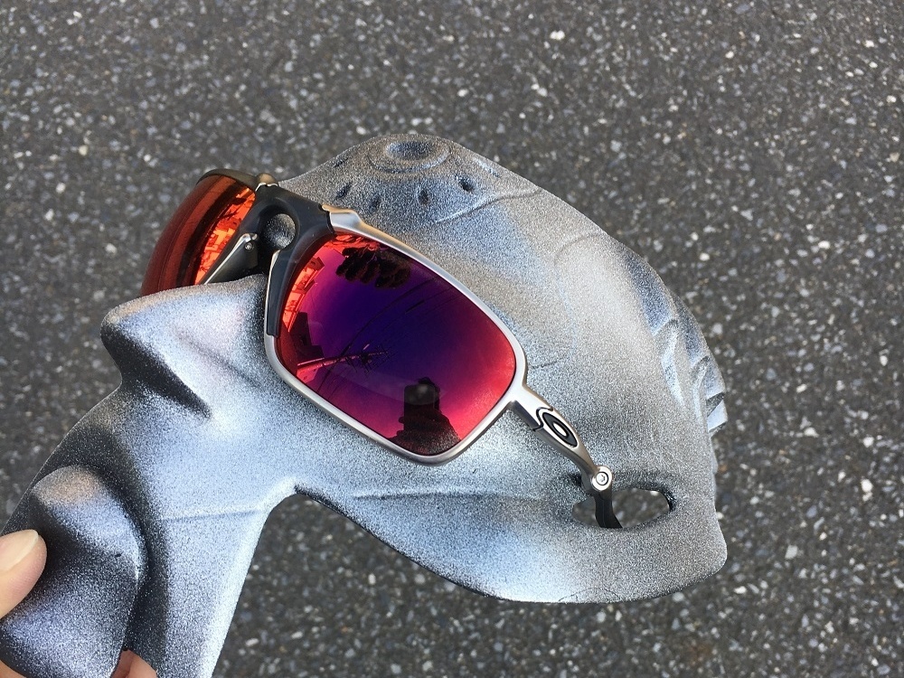 ミラーはOAKLEYのルビーイリジウムに近い色合いのミラーで、裏面はARコーティングが付いています。ベースレンズもルビーイリジウムと同じダークグレーです。