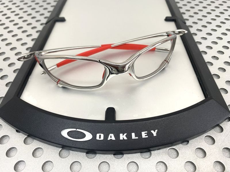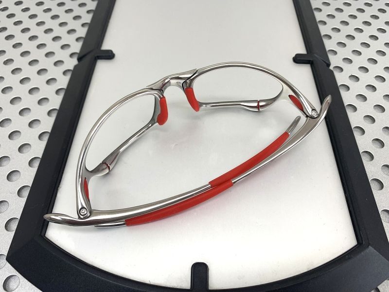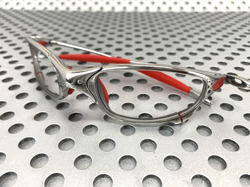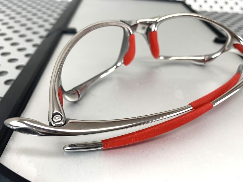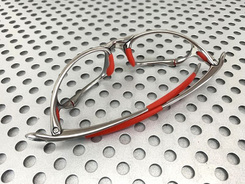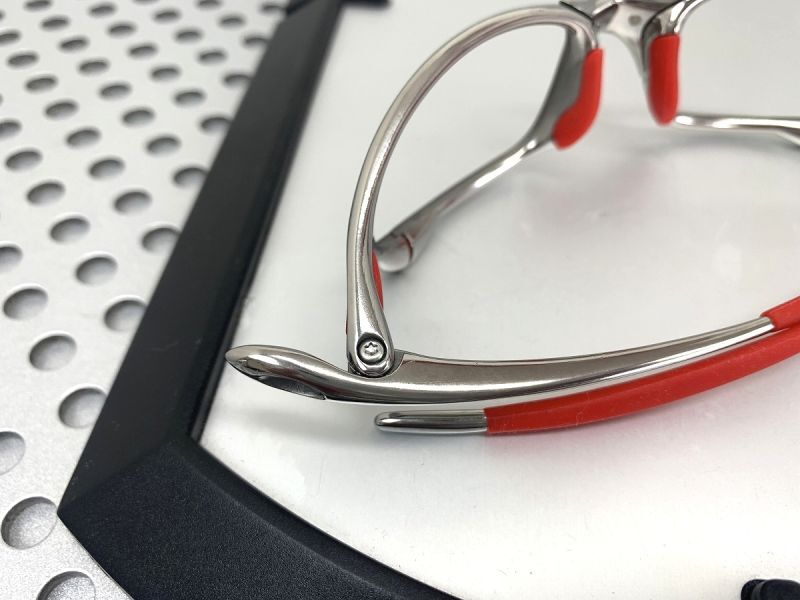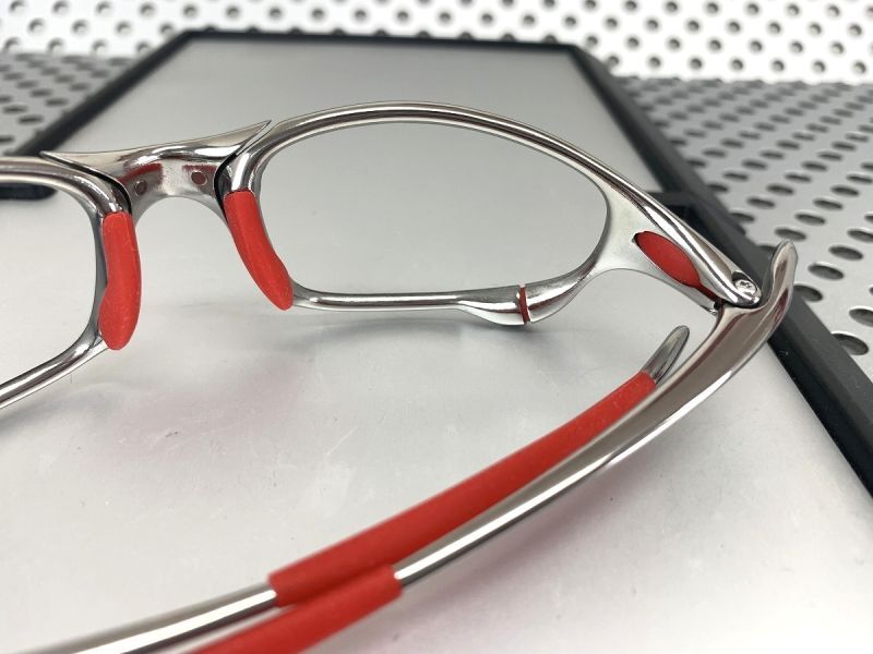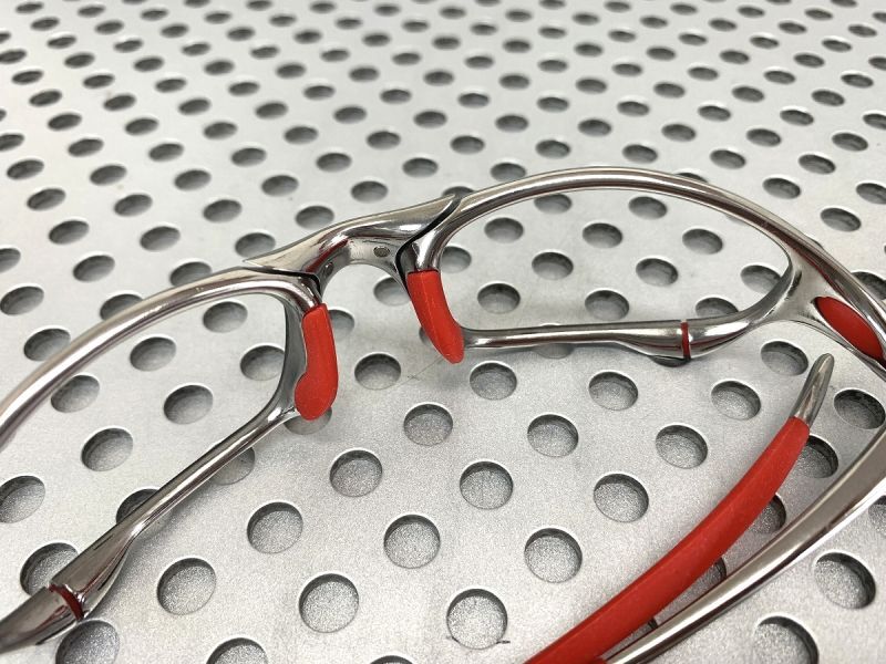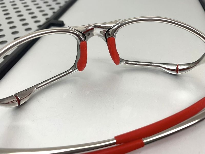 ジュリエットの第一世代はもともと手作業で仕上げられているため、ノーズの突起部分は製造時の、型から外した後は触られていません。ですので角ばっていて、ノーズブリッジを硬めに維持するには最適の形状をしています。後期モデルは型から外した後にバレル研磨されていますので、ノーズの先端の突起はそのことにより角が削られてしまって薄く、細くなっています。そのことがノーズの緩みの一因になってしまっています。