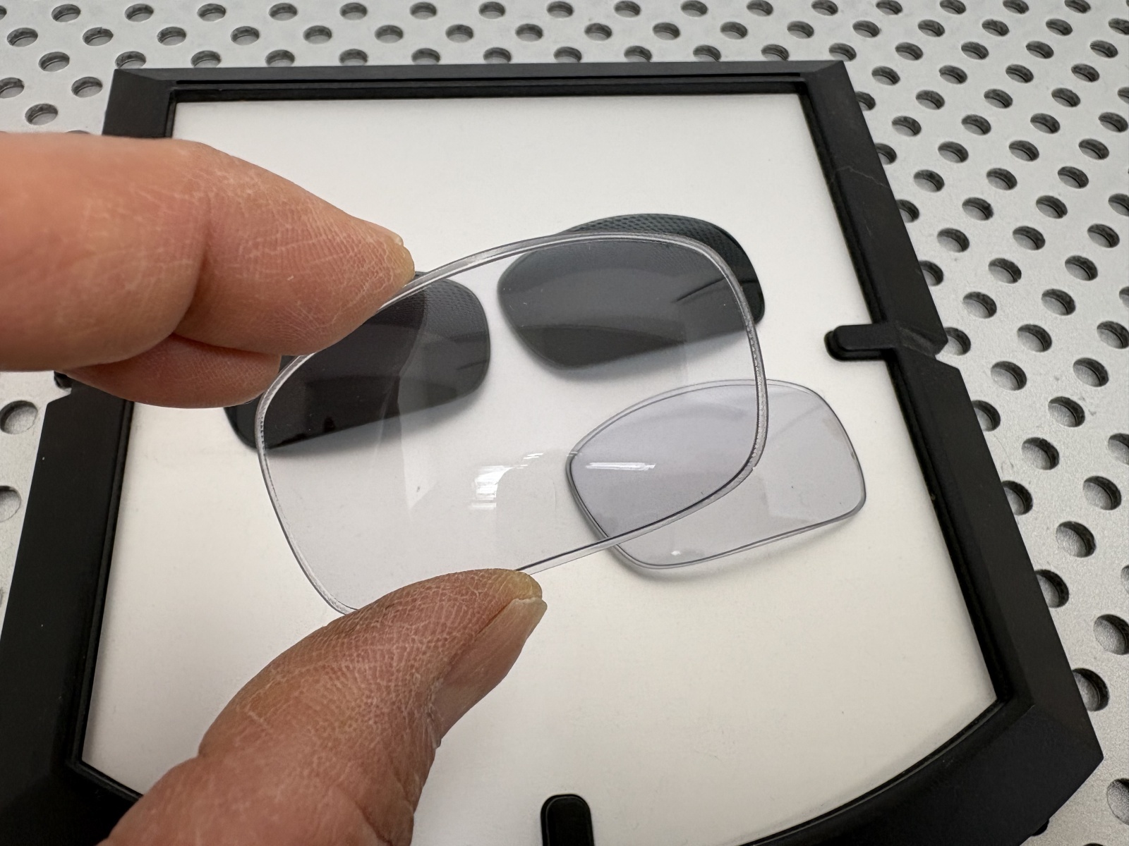 プリズム補正機能(Dセンター)レンズなので、視野のゆがみも矯正します。しかも調光レンズ、サングラス着用者のシチュエーションに合わせてレンズが最適な視野を、レンズ自体が色を変えることによって調整してくれます。