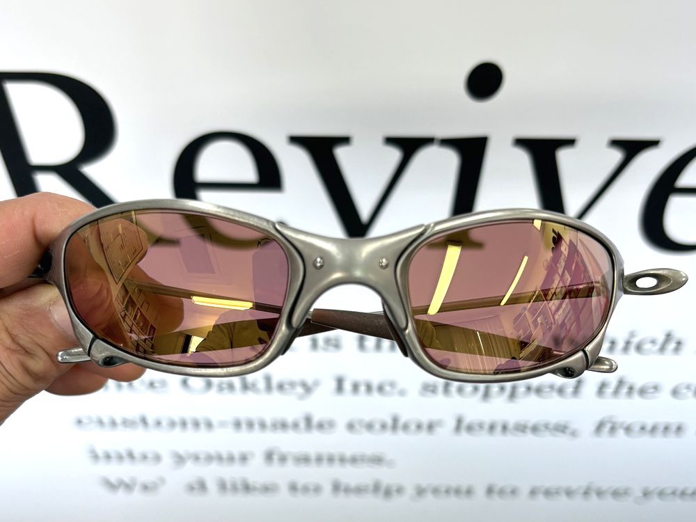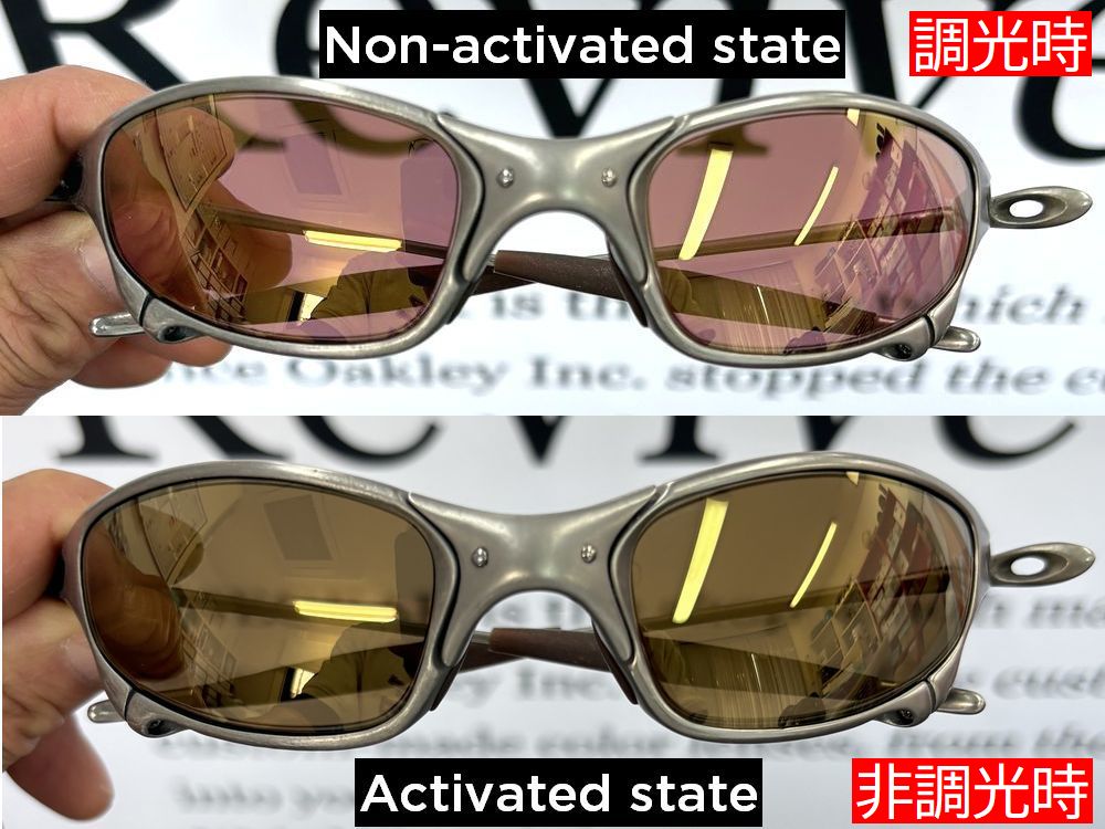 レンズカラーの印象としては、調光していないときは透明感のある、少しピンクっぽいゴールド、調光時はゴールドミラーが強調されます。ミラーがしっかりと入っているので、非調光時でもほとんど目が透けて見えることはありません。とても上品な印象のゴールドレンズになります。