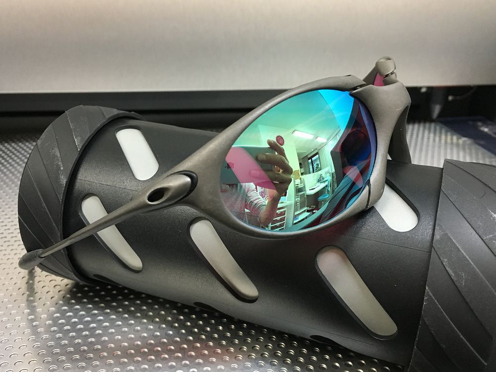 ピンク系のHDベースレンズにターコイズブルーのミラーが付いています。ピンクとブルーの色のミックスがとても綺麗です。ミラー反射が無いときはベースレンズのピンクが強調されますので、目が透けて見える感じになります。